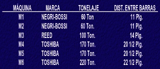Contamos con maquinaria marca Negri-Bossi, Reed y Toshiba con capacidades de 60 hasta 220 toneladas y distancia entre barras de 11 hasta 22 1/2 Pulgadas.